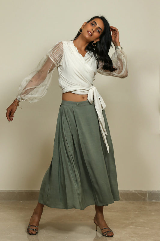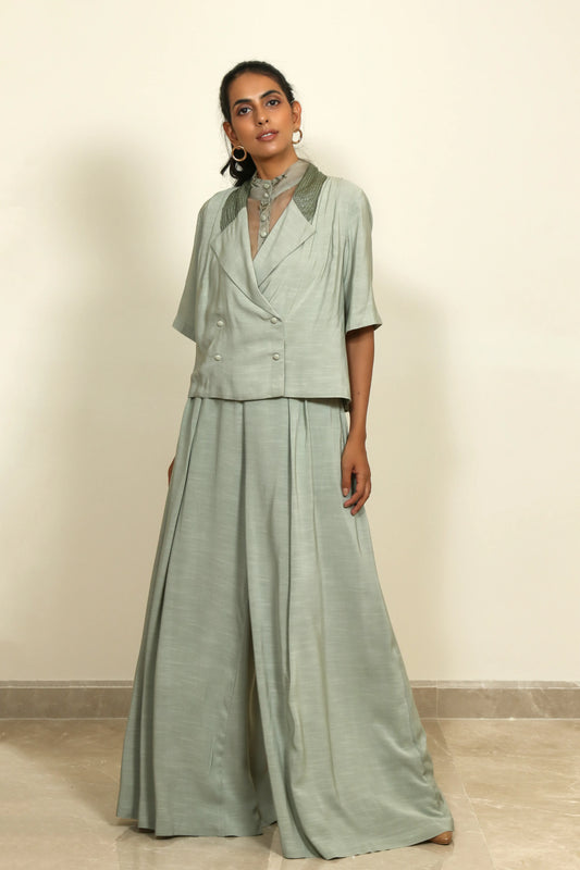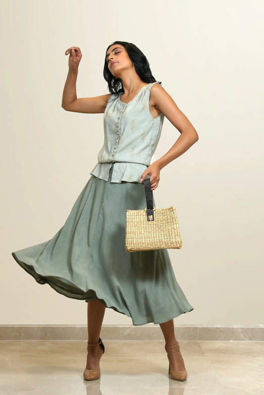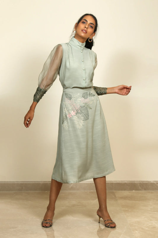 The collection is inspired by the Rainforests, borrowing from its endearing colours, patterns and textures. It uses colours such as ivory, fresh hues of green, peach and subtle use of yellow in details. This collection showcases block- printing, pin-tucks and tonal textures created by hand embroidery and cutwork embroidery done on organza base in different patterns of foliage.