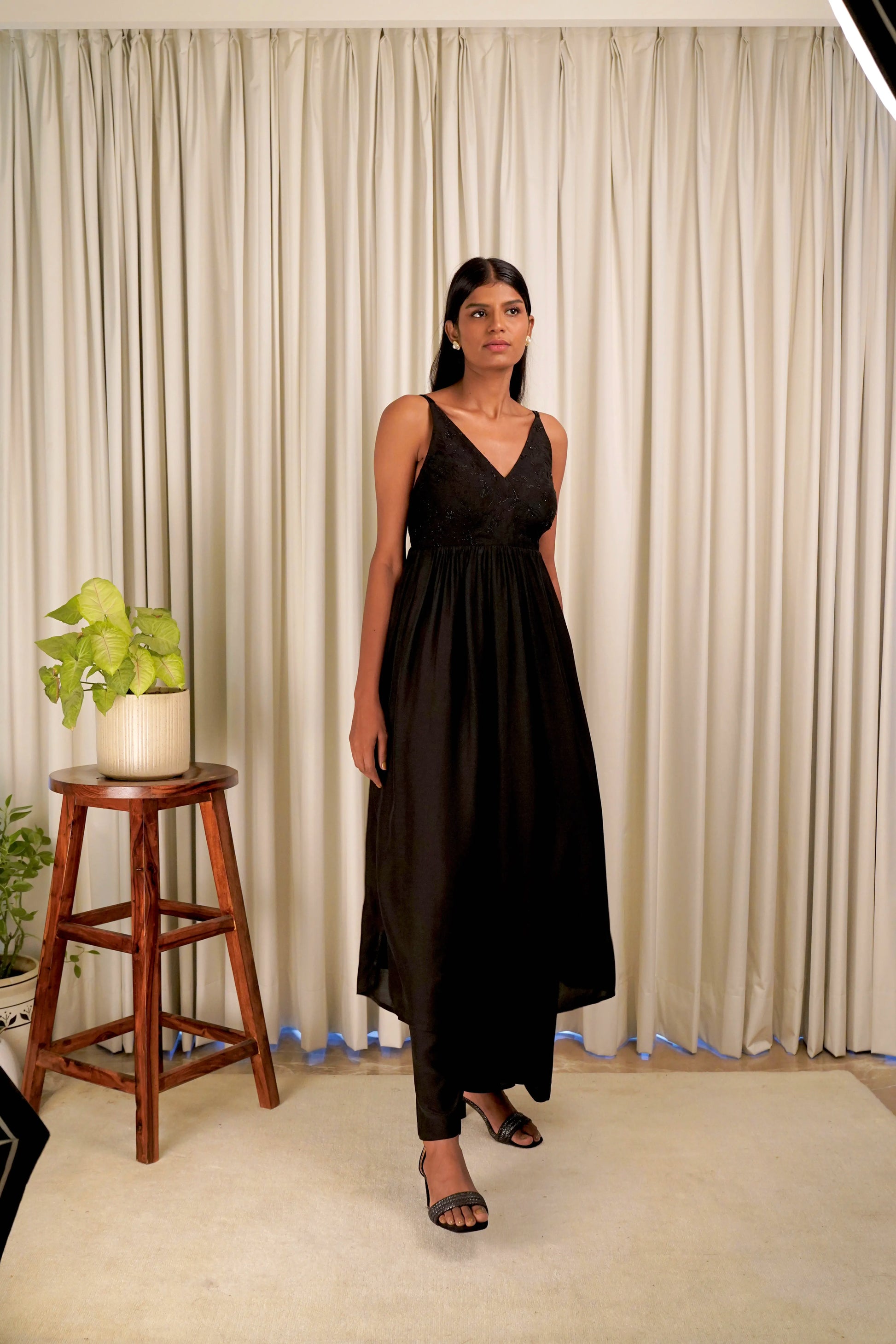 Black tunic featuring tonal embroidery and tie- up back detail. Paired with a straight pants.