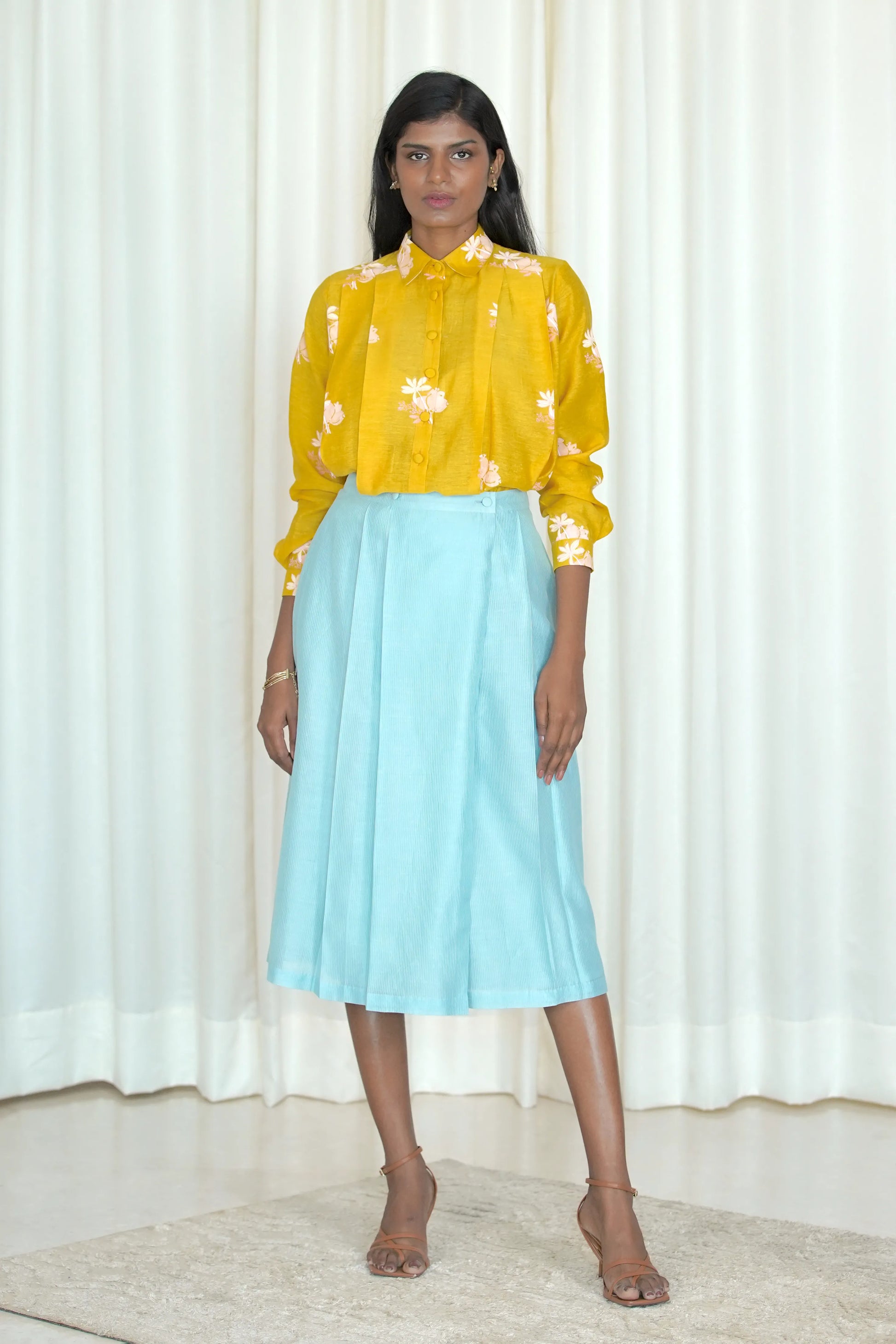 Print pleated shirt. Yellow shirt in cotton linen with floral block print.