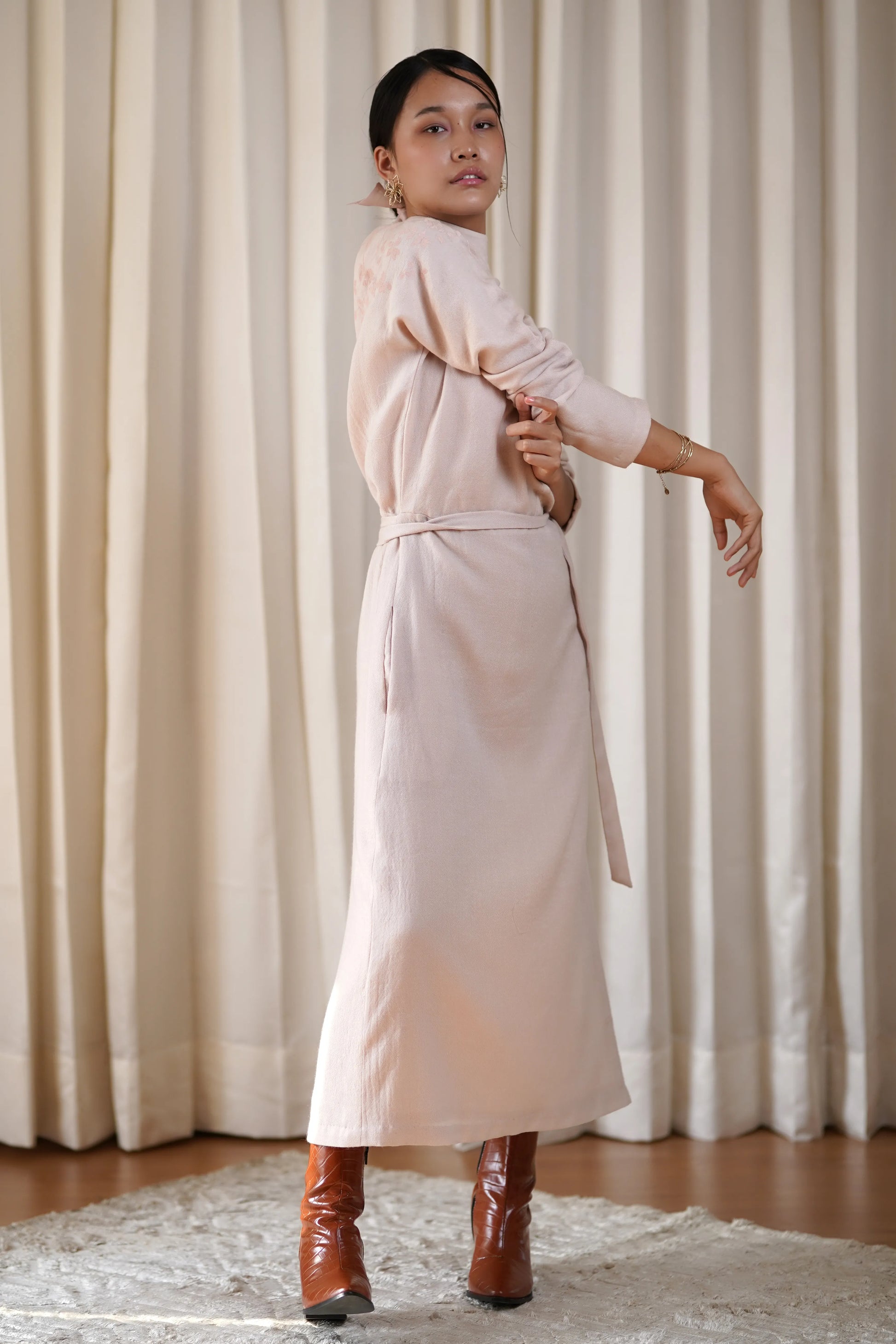 Printed woollen kimono dress with a cut-out back and tie-up belt details.
