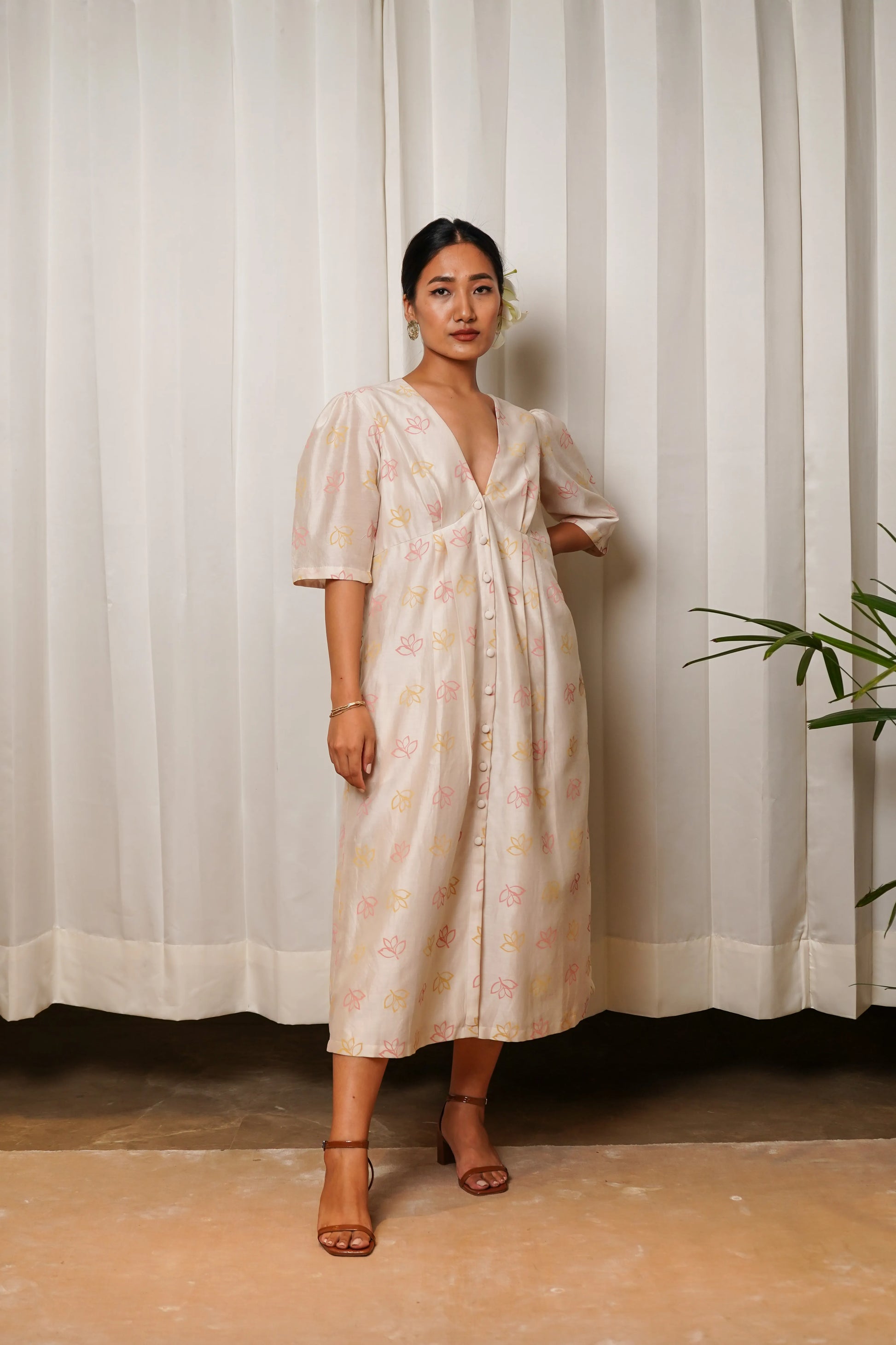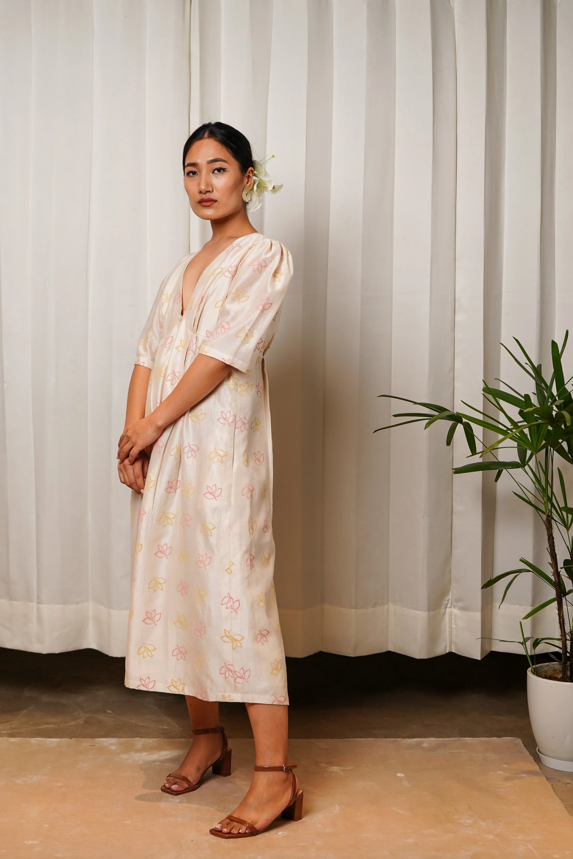Printed Chanderi dress featuring statment sleeves and double pleate details.