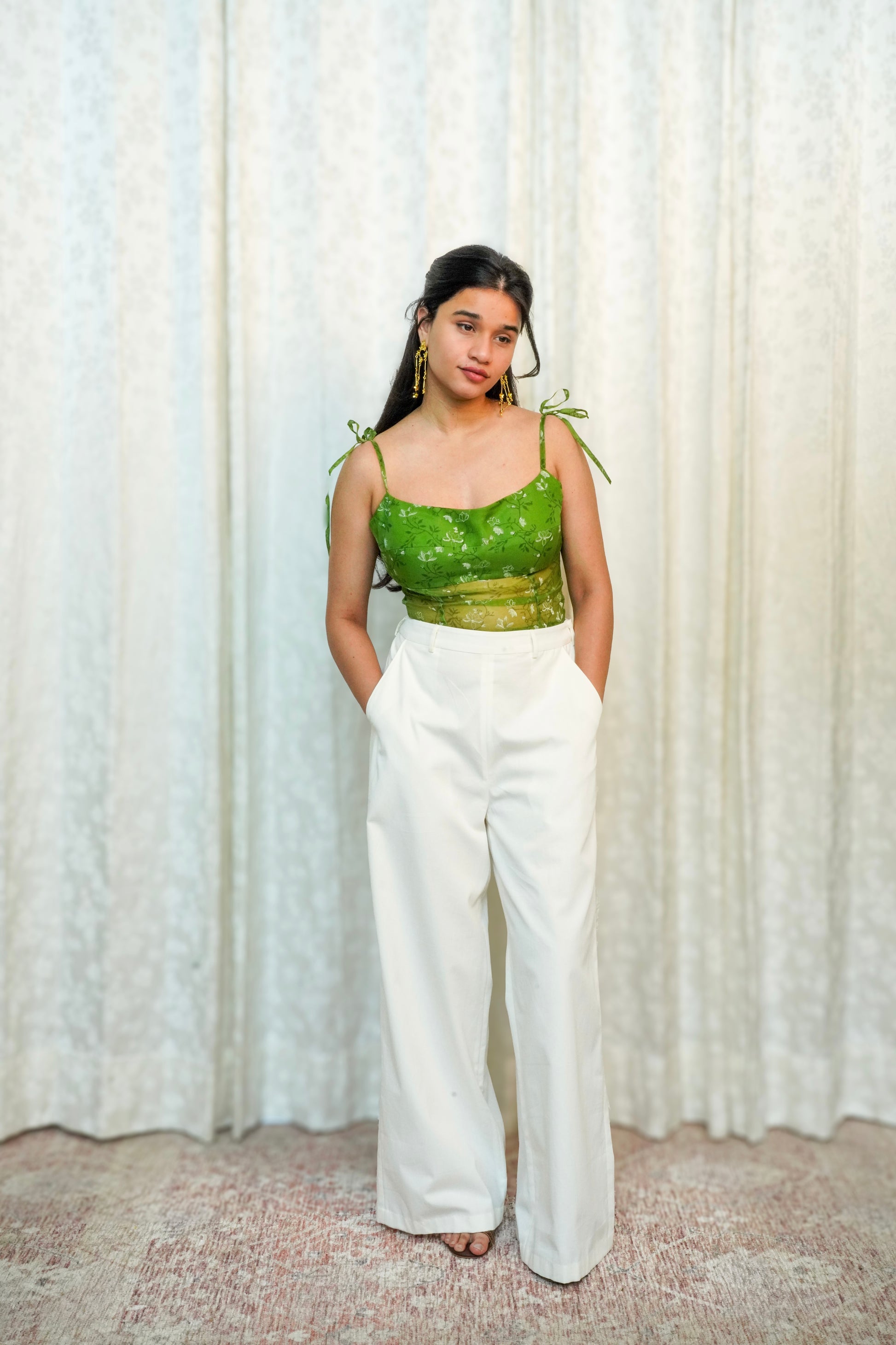 Ivory green high-waisted, wide maxi pants crafted from cotton twill.