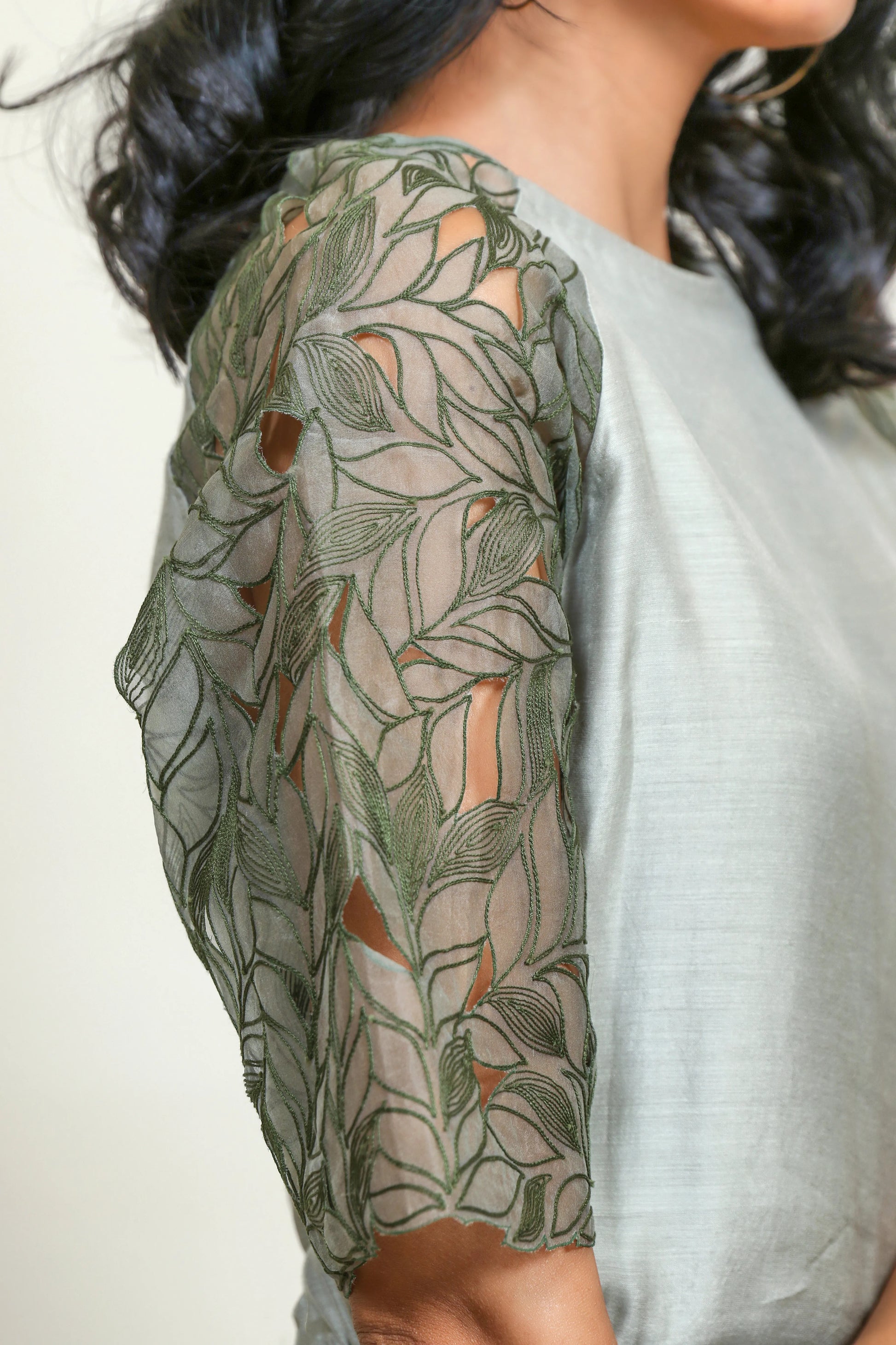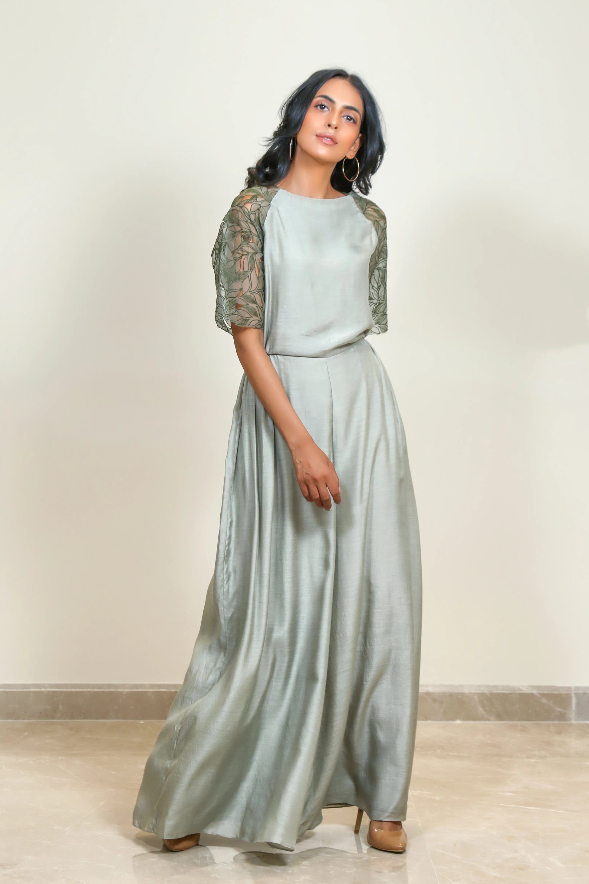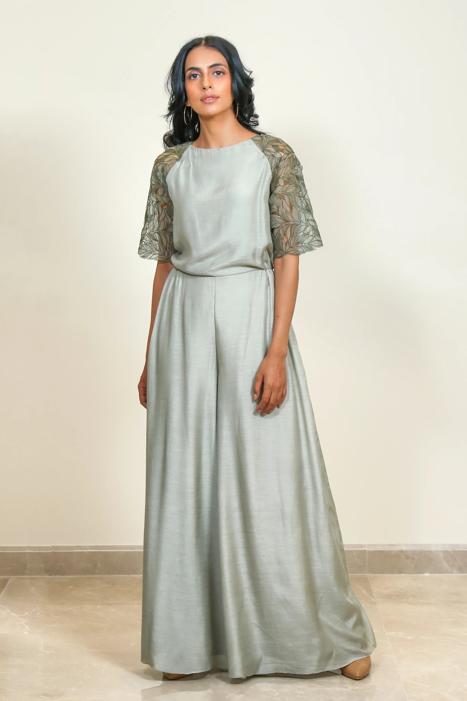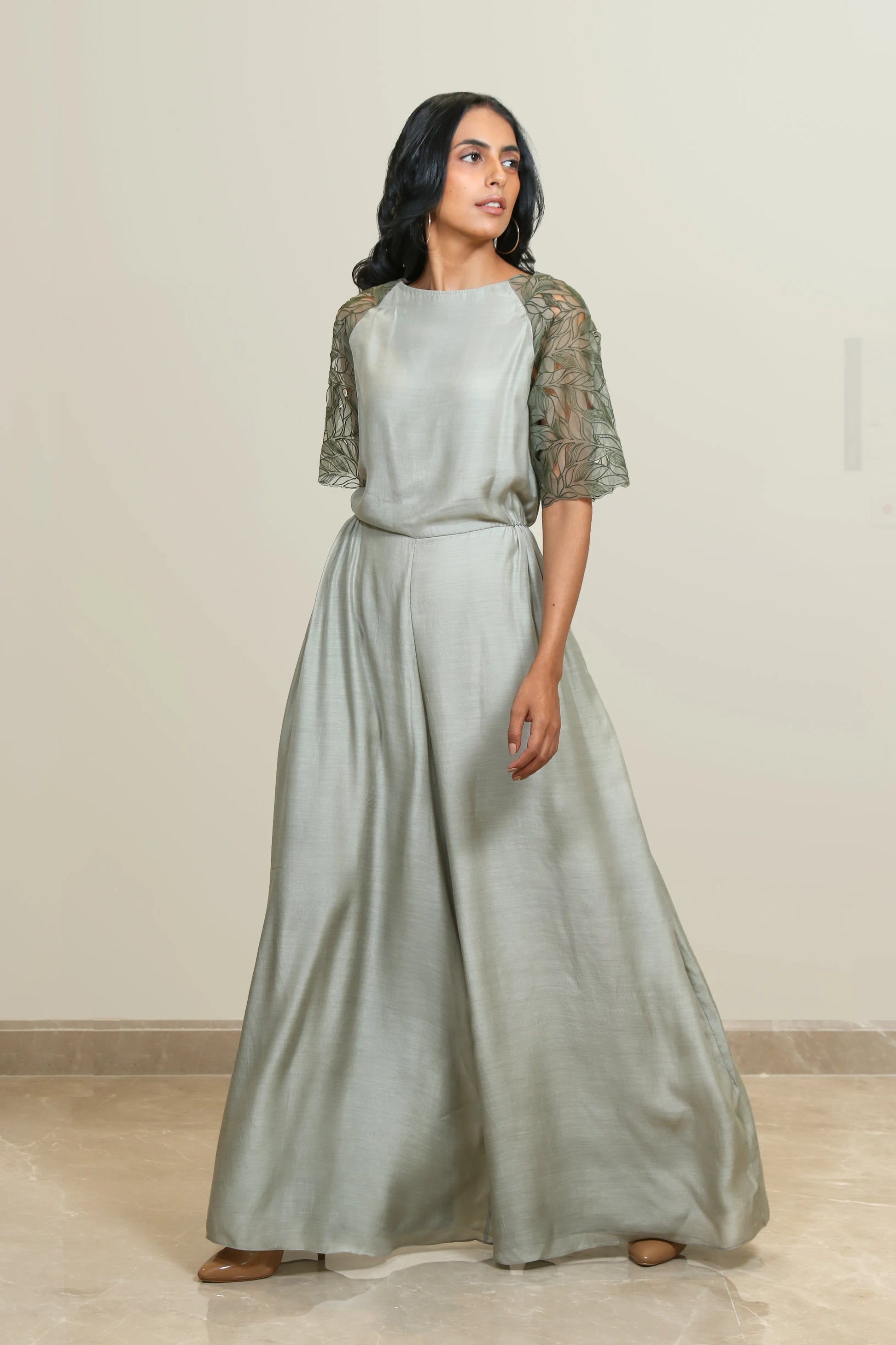 Pleated jumpsuit featuring organza embroidered sleeves with leaf cutwork details.