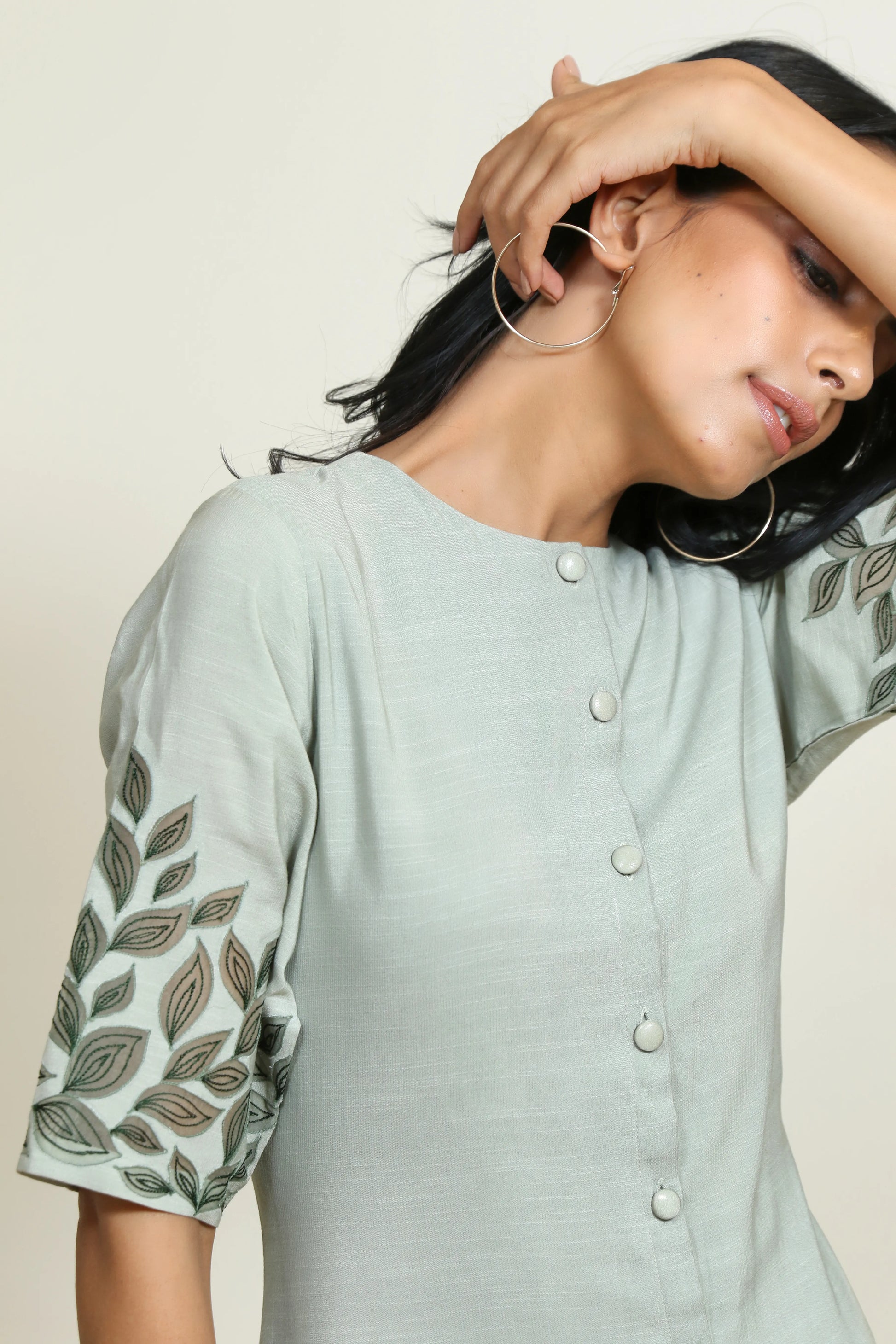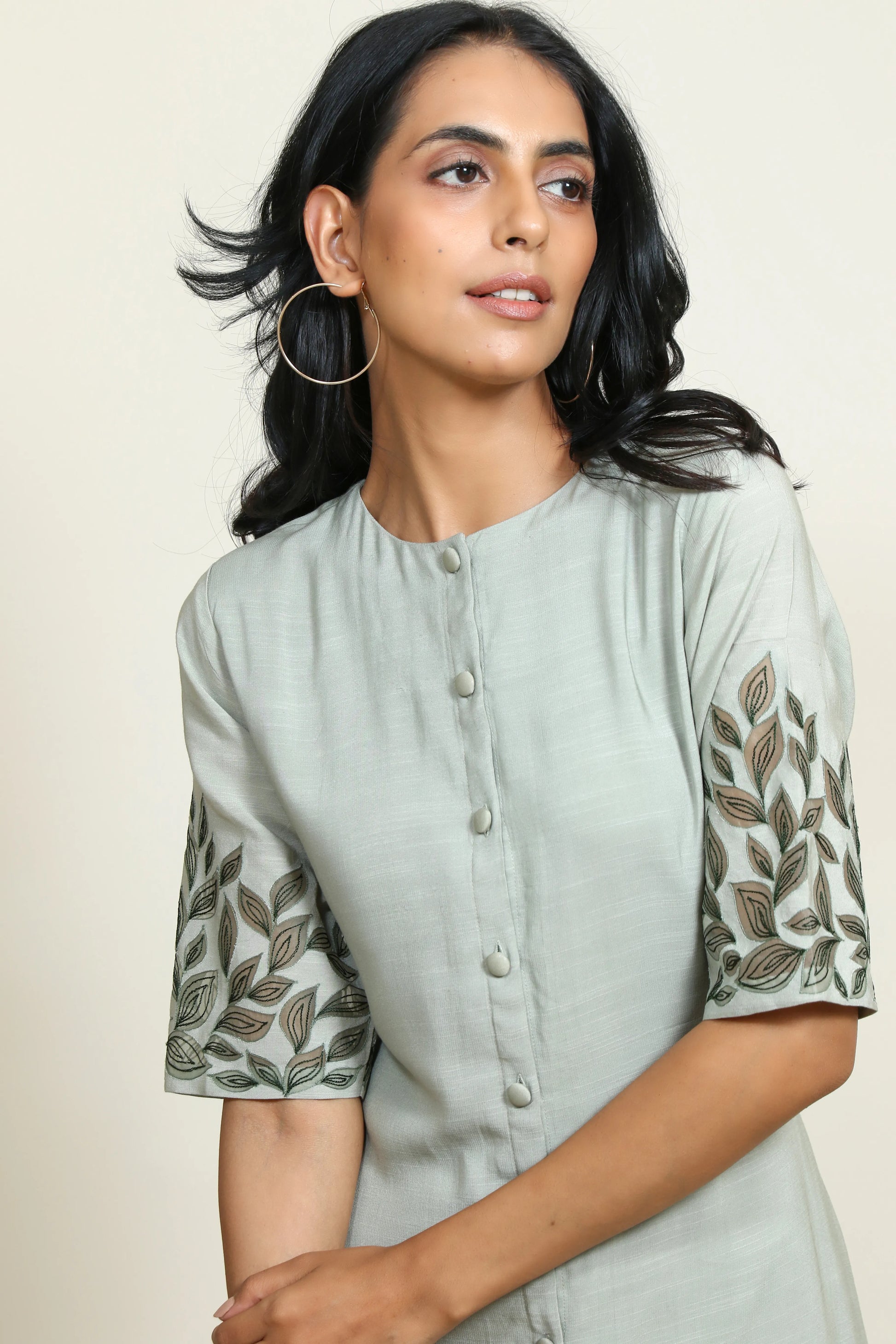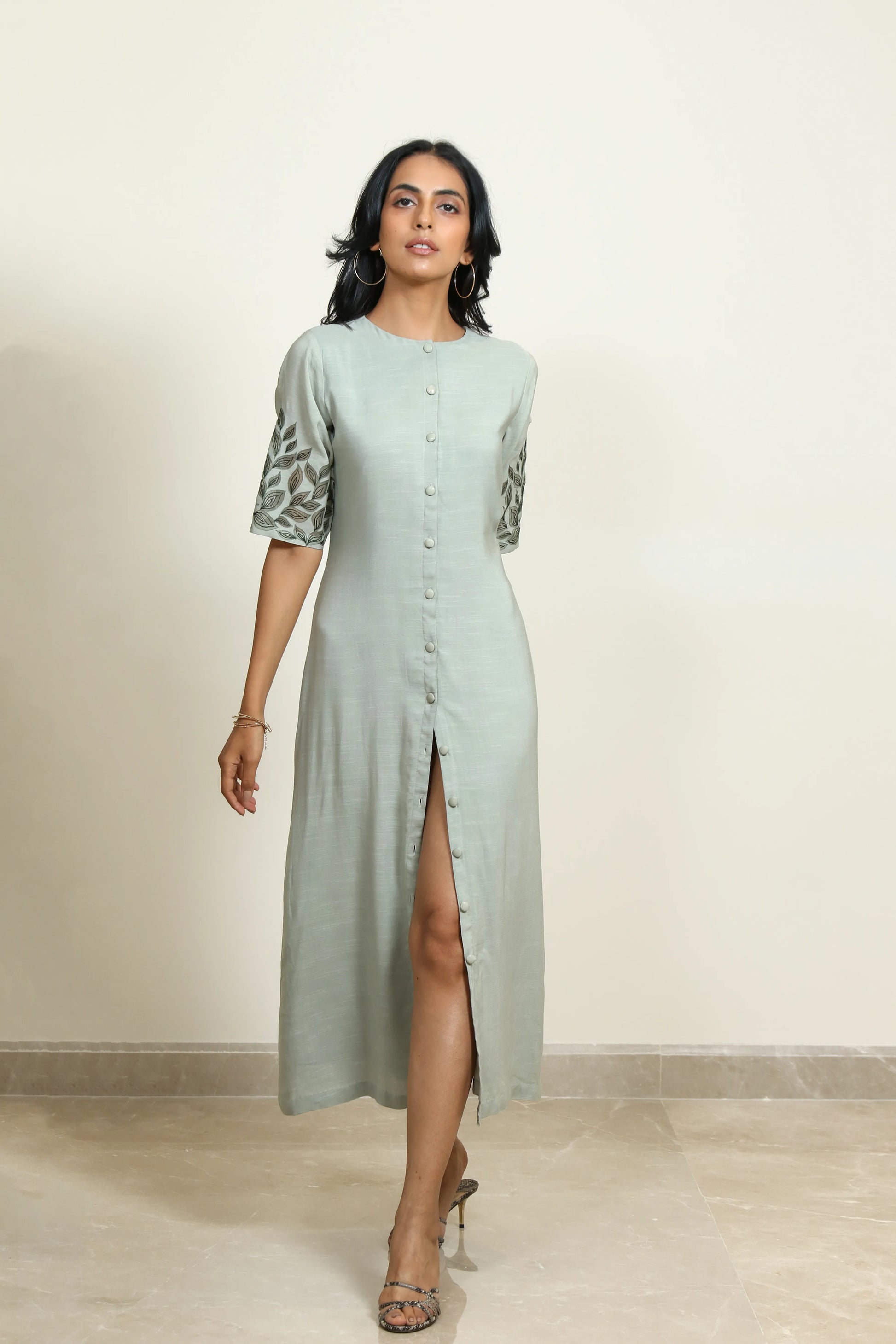 Sage green buttoned-down pencil dress with embroidered sleeves detail.