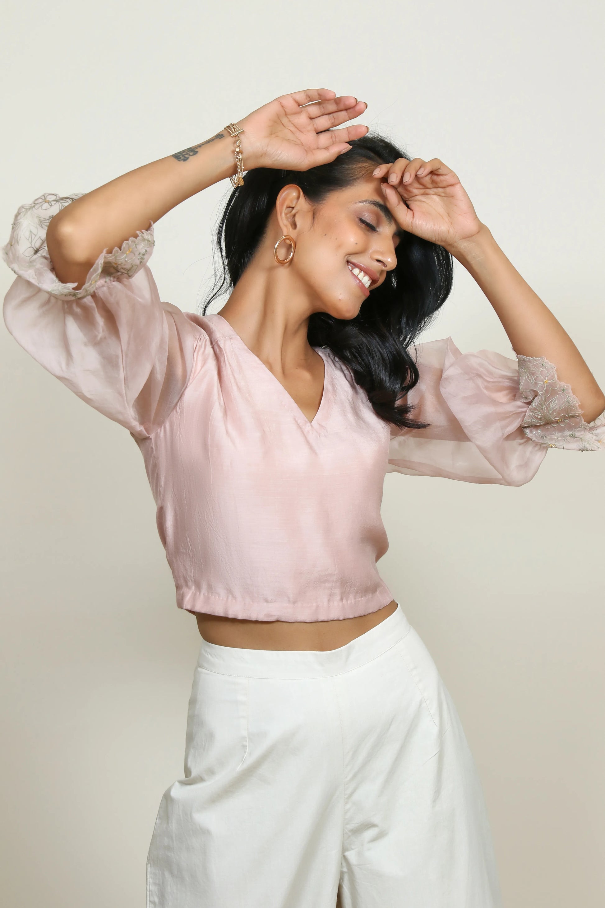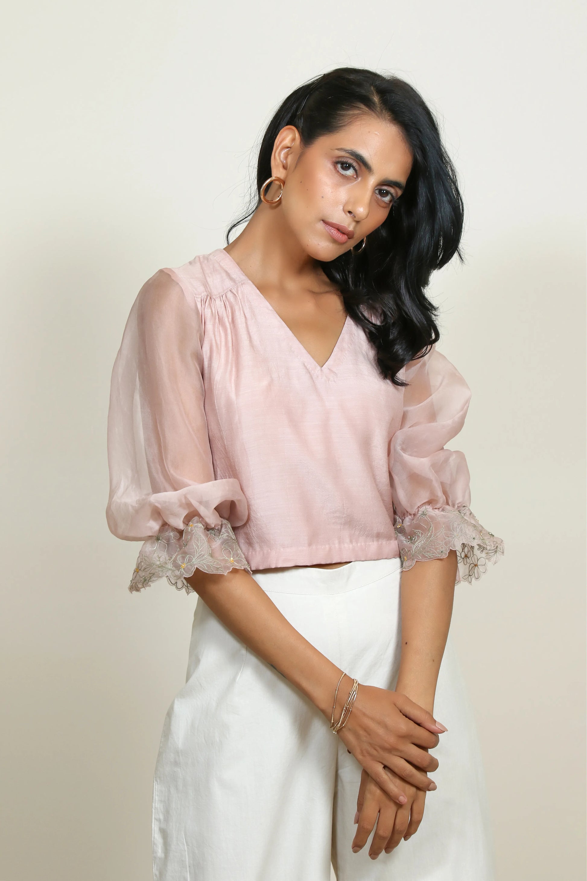 Peach cropped top featuring organza sleeves with cutwork embroidery.