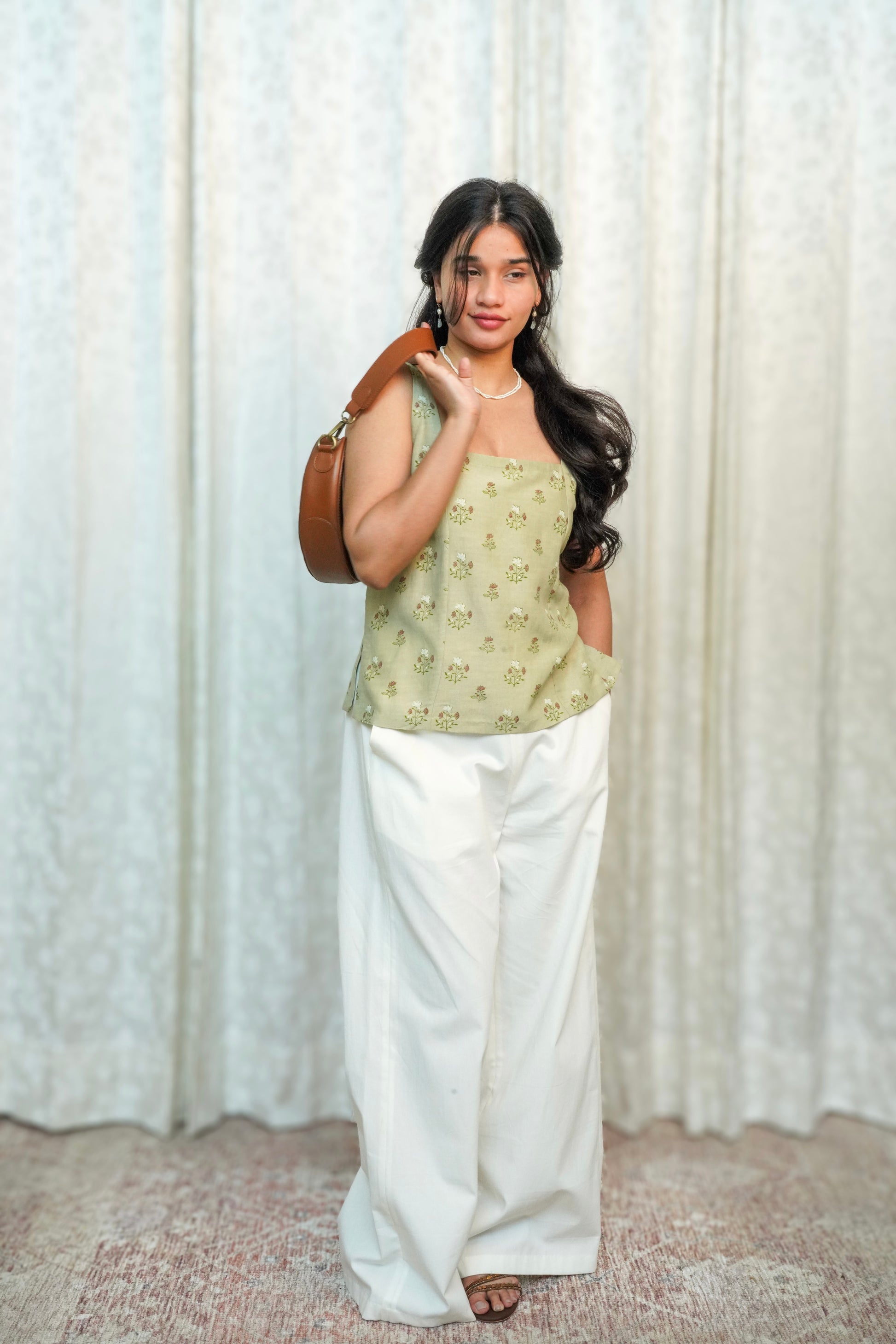 Sage panelled top crafted from Linen Excel, designed for a relaxed yet flattering fit.