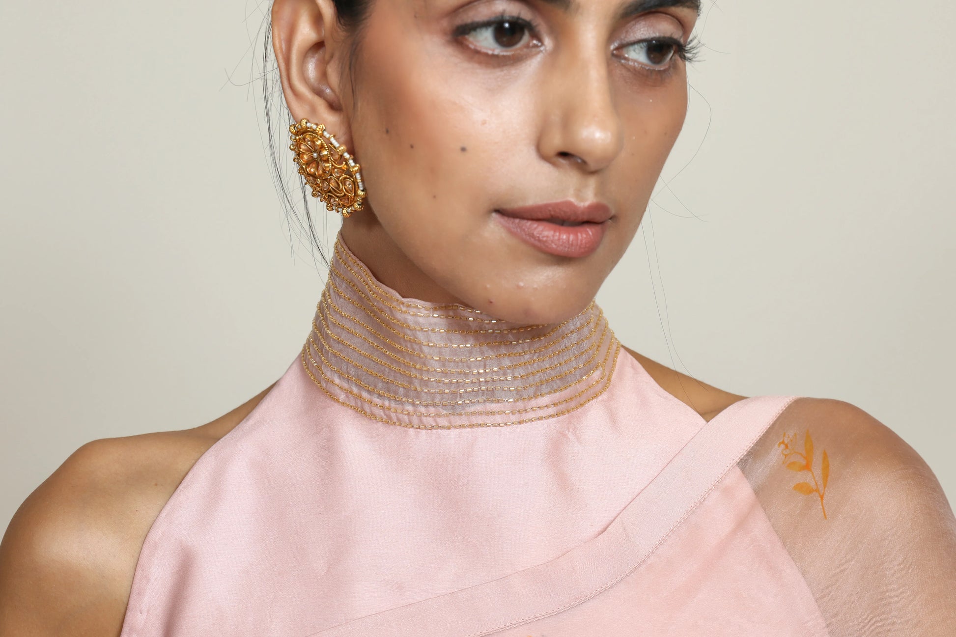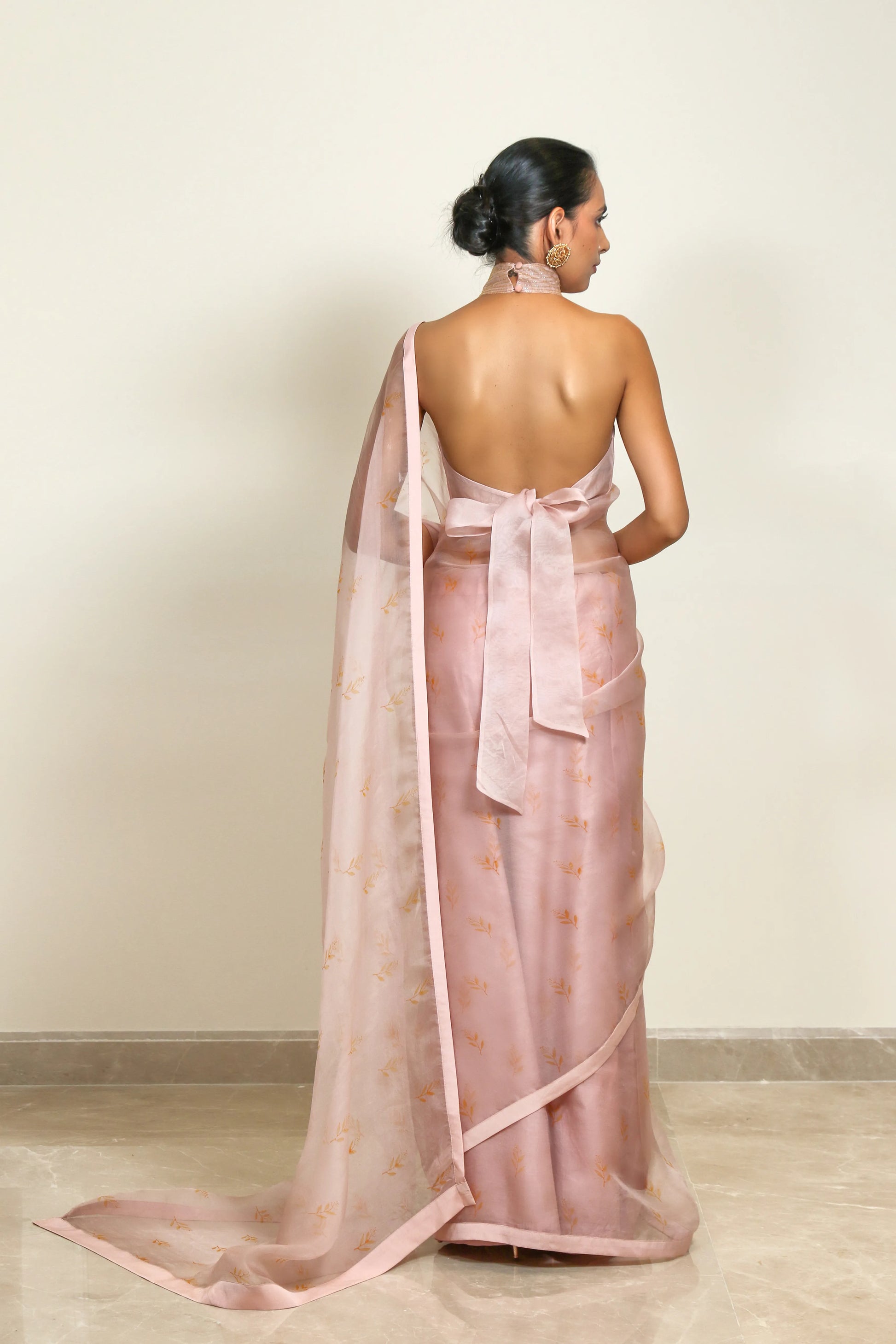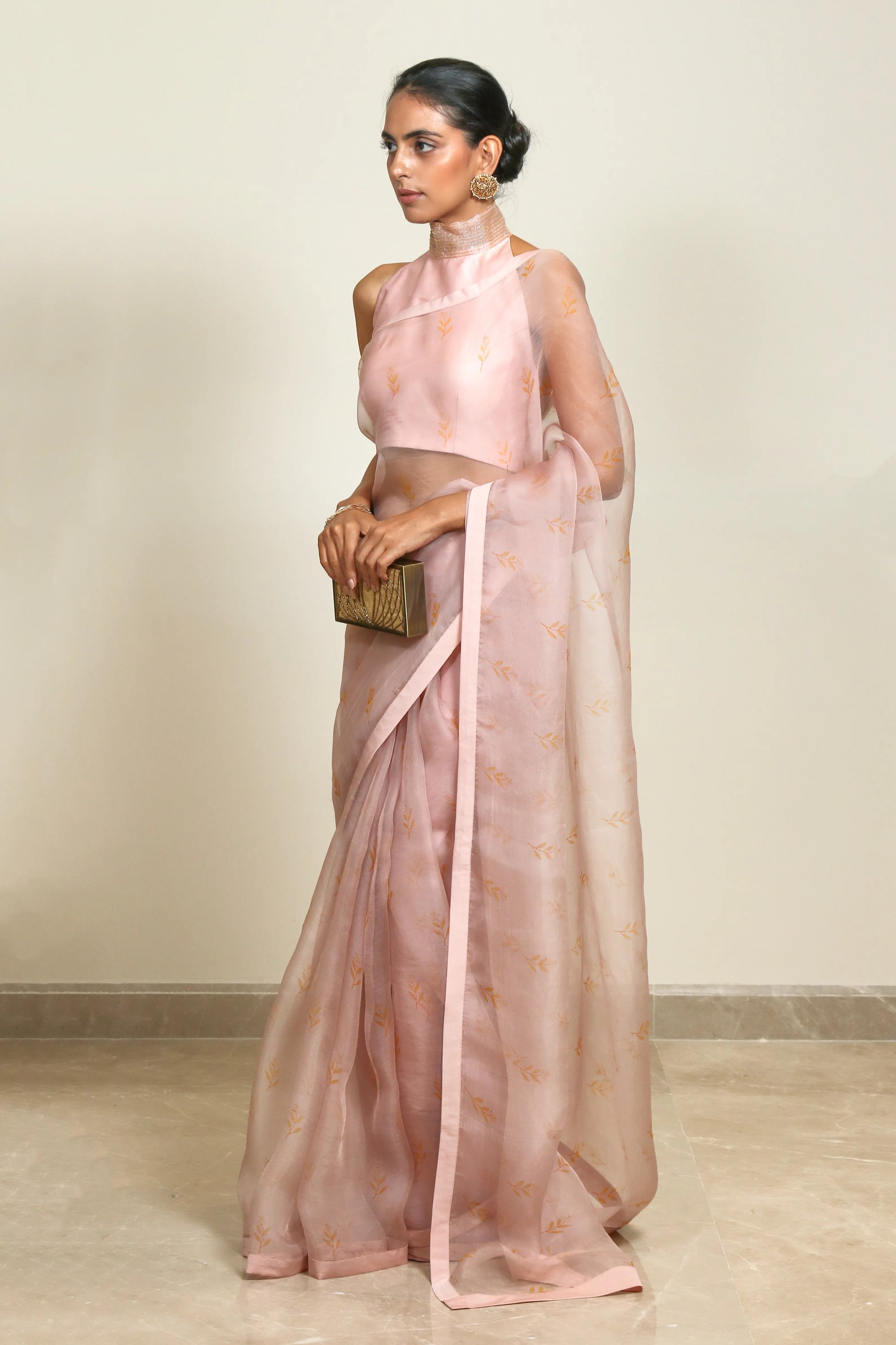 Peach printed organza sari with yellow foliage print details, pared with Chanderi blouse piece with embroidered organza collar and organza for back tie.