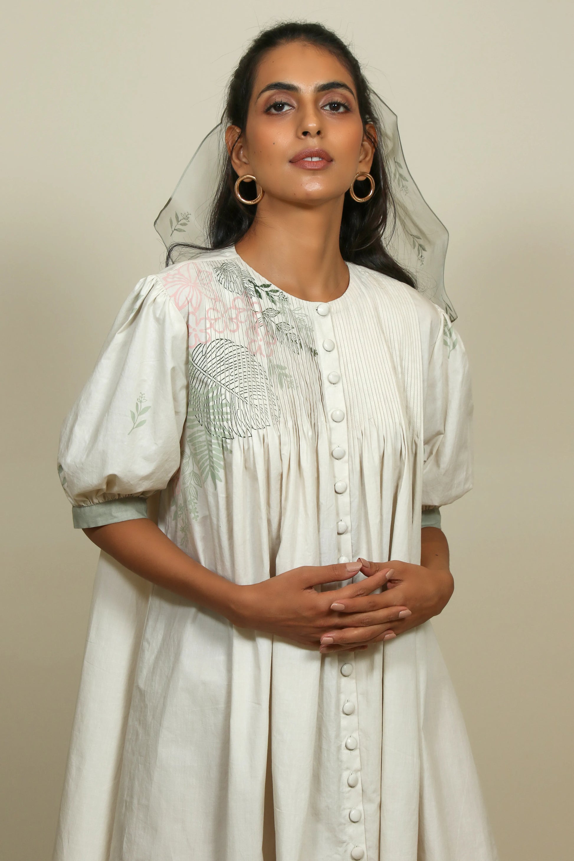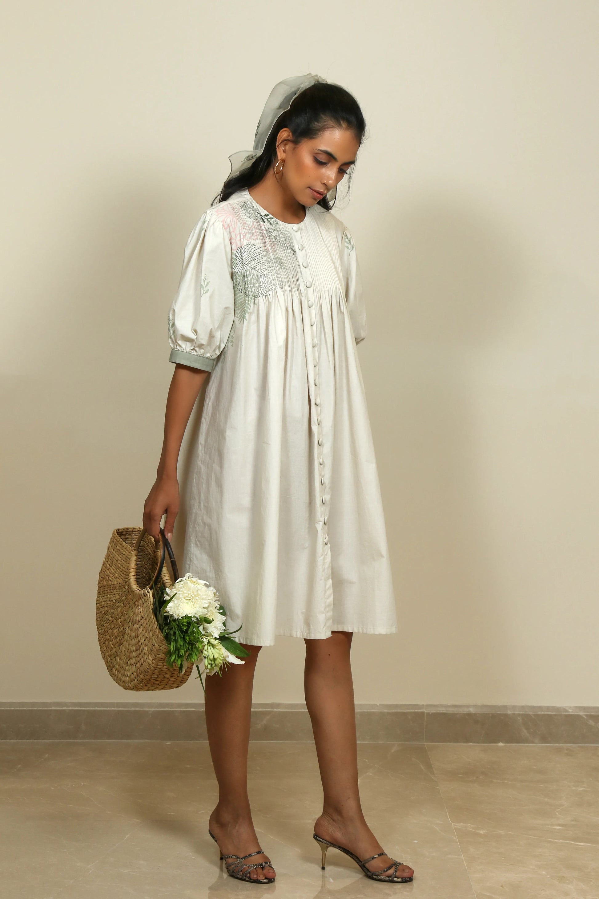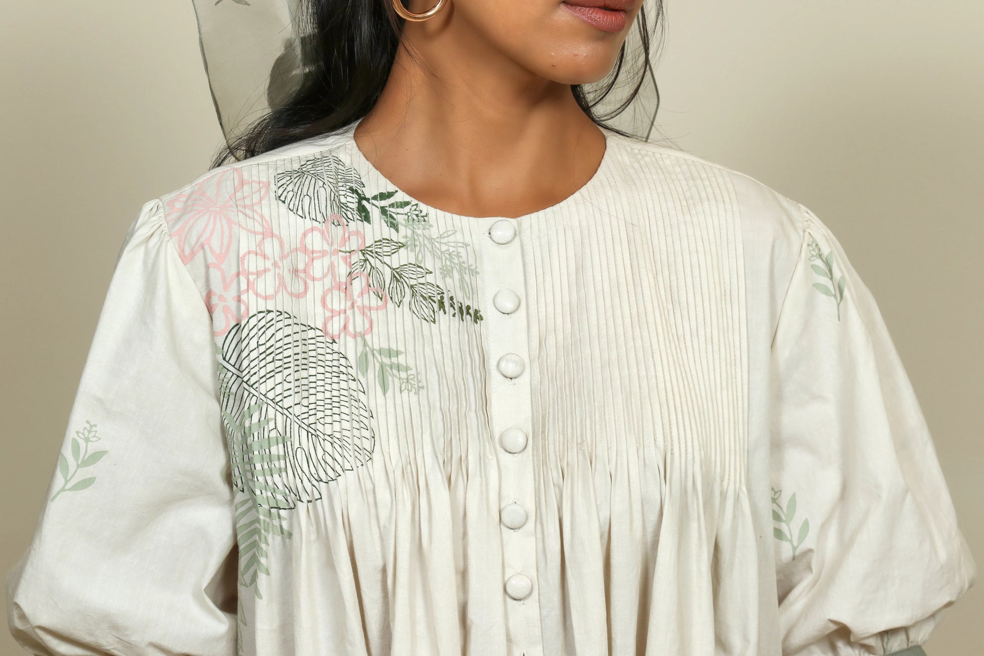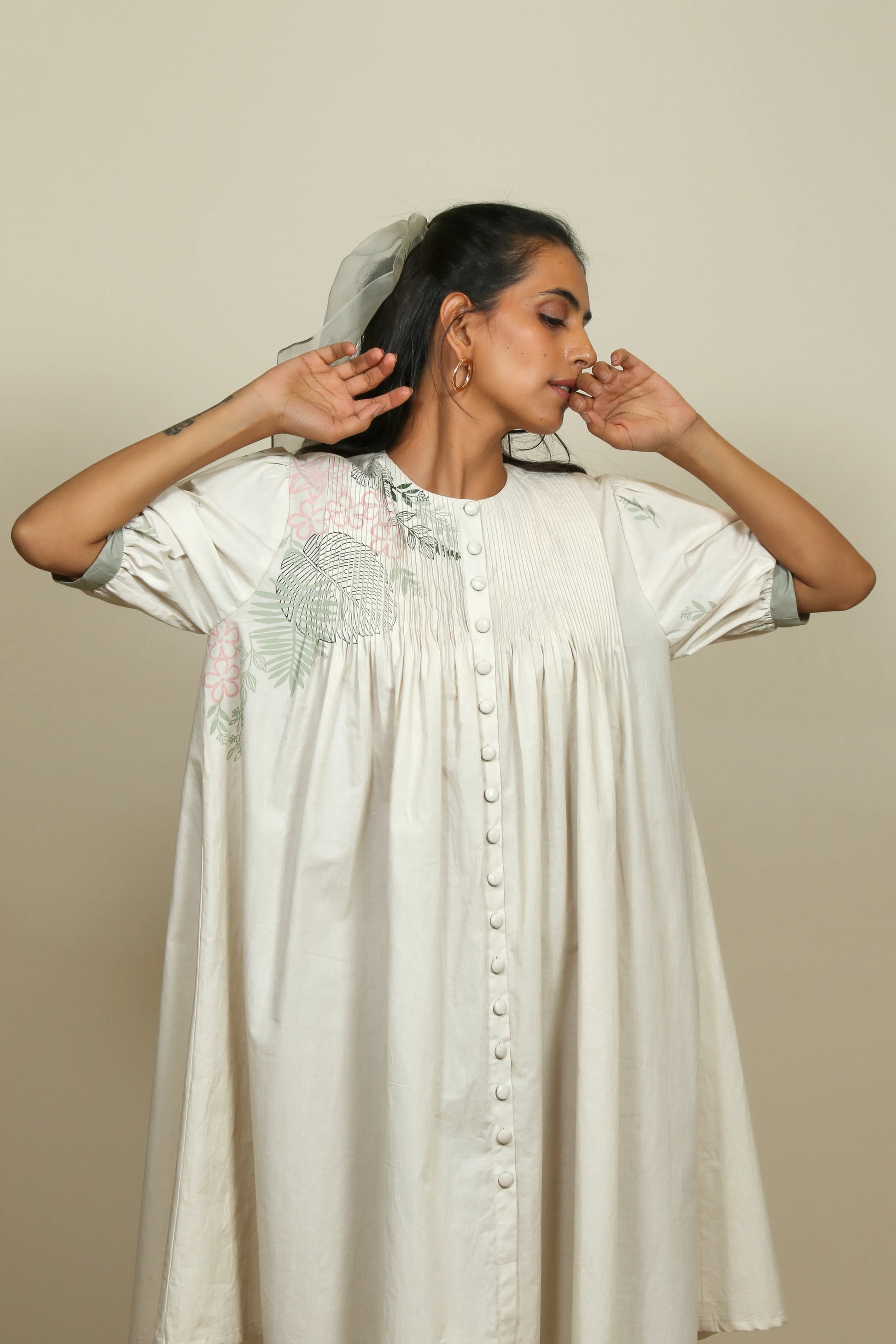 A perfect summer ivory shirt-dress with details of pintucks and overlay patterns with block printing technique.