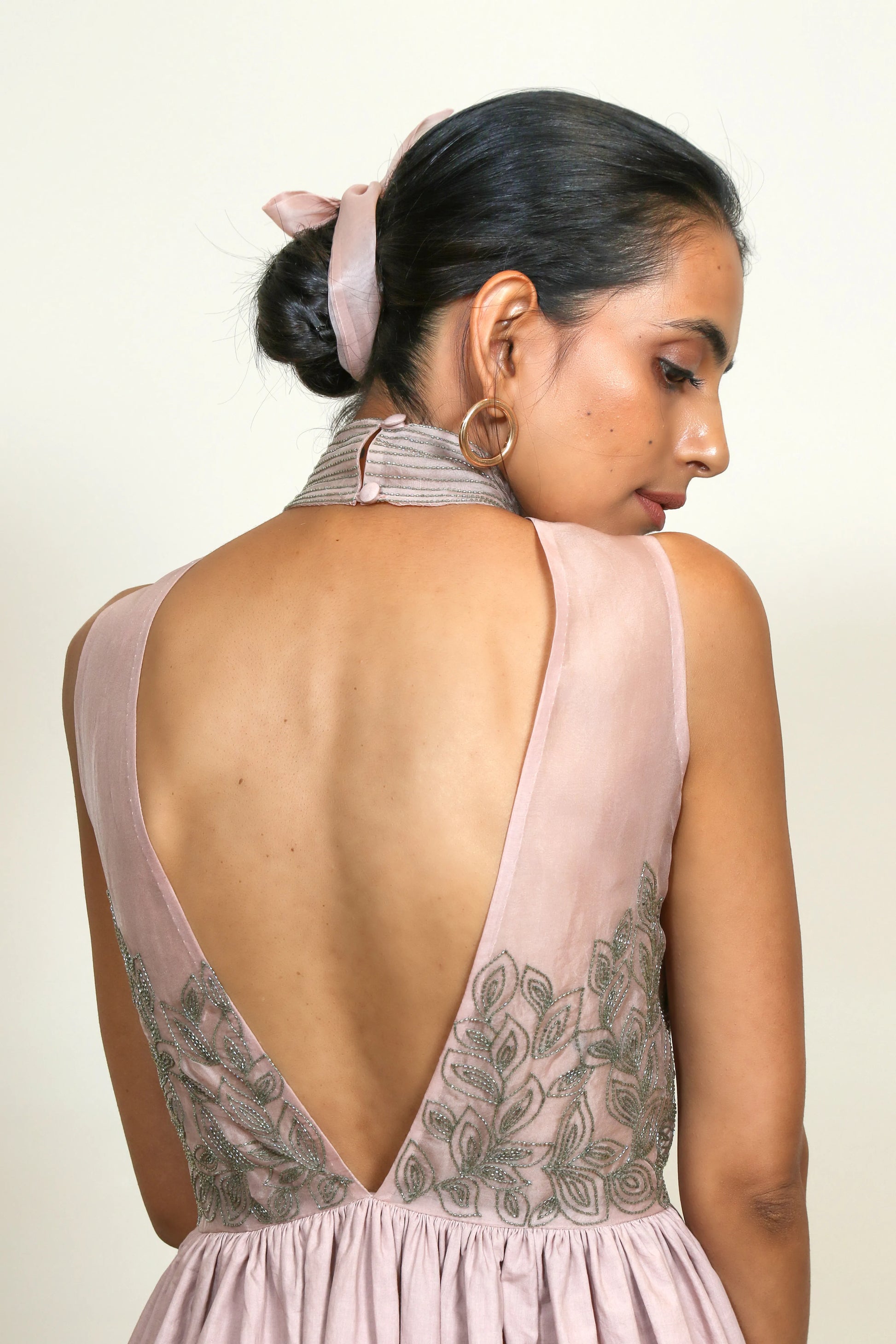 Peach flounce dress with organza embroidered collar and cutout back details.